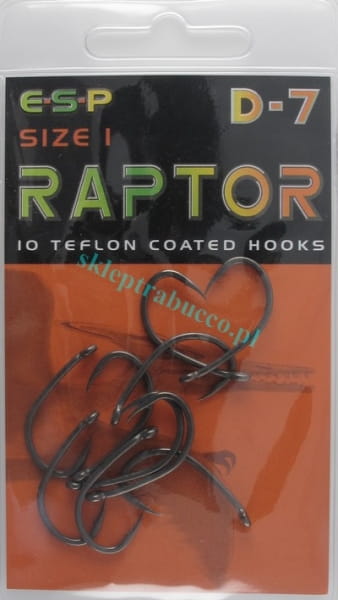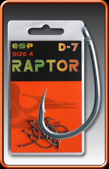 Haczyki ESP są jednymi z najbardziej zaawansowanych technologicznie haków na rynku.Używane przez reprezentację Anglii co świadczy o ich jakości.Każdy rozmiar zaprojektowano osobno aby zachować odpowiednią proporcję elementów,kąty wygięcia oraz długość trzonka i grotu są idealnie dopasowane do rozmiaru haka.Polecane przez sporą rzeszą karpiarzy jako najostyrzejsze na rynku.ESP RAPTOR D 7 - ma oczko ugięte pod kątem 16° i lekko zagięty grot. Trzonek jest krótki, a dzięki kombinacji tych cech haczyk zapewnia łatwe zacięcie i zapobiega spinaniu się ryb. Wykonany z wysokowęglowej stali, kuty, pokryty teflonem.Ilośc w opakowaniu 10 szt.