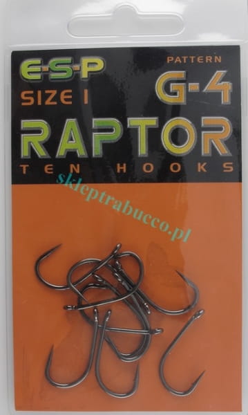 Haczyki ESP są jednymi z najbardziej zaawansowanych technologicznie haków na rynku.Używane przez reprezentację Anglii co świadczy o ich jakości.Każdy rozmiar zaprojektowano osobno aby zachować odpowiednią proporcję elementów,kąty wygięcia oraz długość trzonka i grotu są idealnie dopasowane do rozmiaru haka.Polecane przez sporą rzeszą karpiarzy jako najostyrzejsze na rynku.ESP RAPTOR G4 - Hak dostępny w najpopularniejszych rozmiarach, zapewnia dobrą prezentację przynęty. Idealny do łowienia z dna na kulki proteinowe i na ziarno.Ilośc w opakowaniu 10 szt.