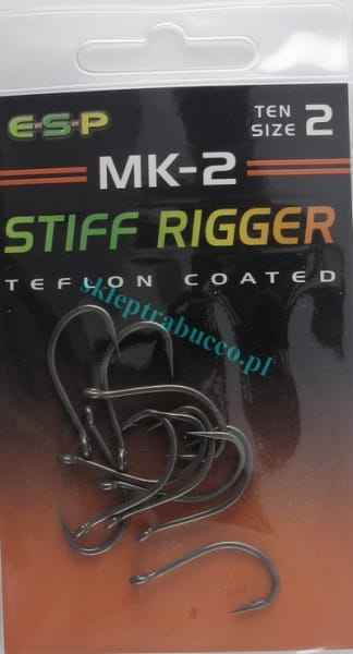 Haczyki ESP są jednymi z najbardziej zaawansowanych technologicznie haków na rynku.Używane przez reprezentację Anglii co świadczy o ich jakości.Każdy rozmiar zaprojektowano osobno aby zachować odpowiednią proporcję elementów,kąty wygięcia oraz długość trzonka i grotu są idealnie dopasowane do rozmiaru haka.Polecane przez sporą rzeszą karpiarzy jako najostyrzejsze na rynku.ESP RAPTOR Stiff Rigger MK 2 - Opracowany do łowienia sztywnymi przyponami, pokryty matową warstwą teflonu, nierozpraszającą światła i poprawiającą wytrzymałość. Grot ułożony równolegle z trzonkiem, dzięki czemu zapobiega spinaniu się ryb.Ilośc w opakowaniu 10 szt.