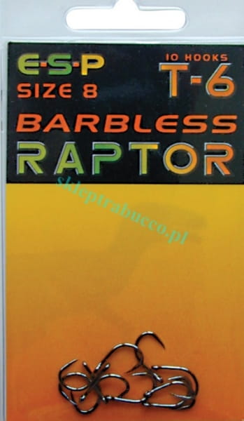 Haczyki ESP są jednymi z najbardziej zaawansowanych technologicznie haków na rynku.Używane przez reprezentację Anglii co świadczy o ich jakości.Każdy rozmiar zaprojektowano osobno aby zachować odpowiednią proporcję elementów,kąty wygięcia oraz długość trzonka i grotu są idealnie dopasowane do rozmiaru haka.Polecane przez sporą rzeszą karpiarzy jako najostyrzejsze na rynku.ESP RAPTOR T-6 bezzadziorowy - Bezzadziorowy hak dostępny w najpopularniejszych rozmiarach, zapewnia dobrą prezentację przynęty. Idealny do łowienia nad dnem.Ilośc w opakowaniu 10 szt.