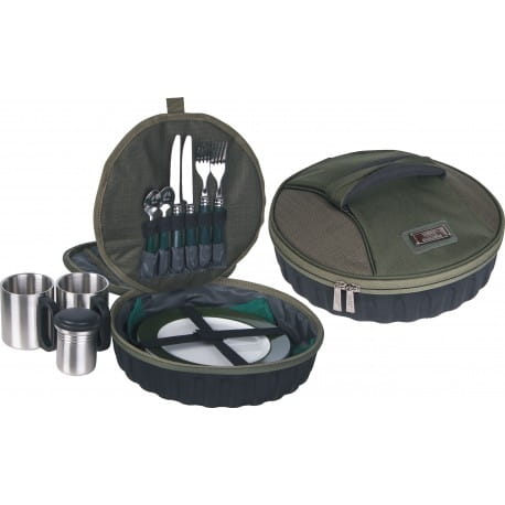 Niezbędne na każdym dłuższym wędkowaniu etui biwakowe, z pełną zawartością potrzebnych rzeczy, tj.: talerze z tworzywa wielokrotnego użycia, wysokiej jakości sztućce, kubki termiczne, szczelny pojemnik na przyprawy. Całość zamknięta w profesjonalnej torbie z przegrodami.